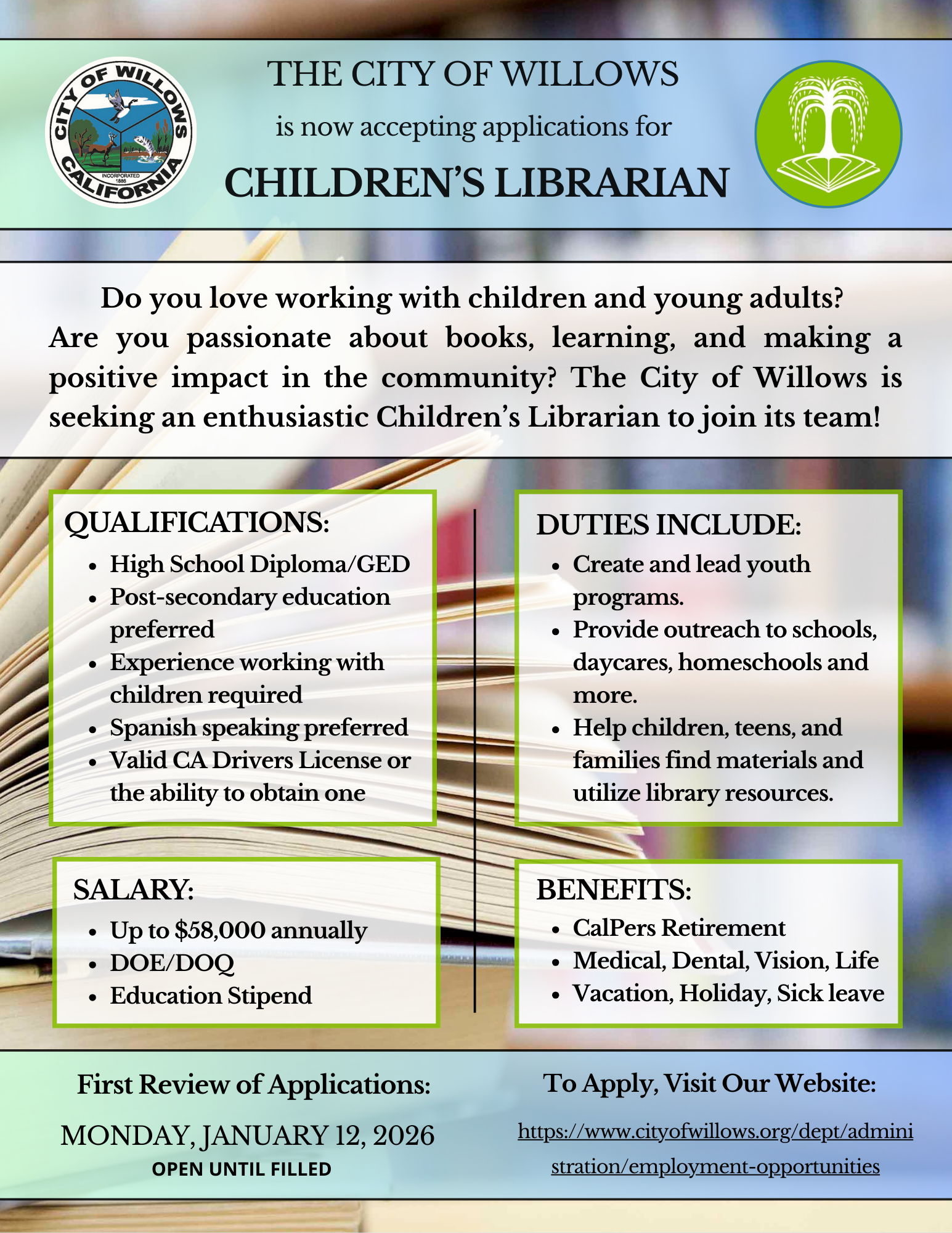 The City is now hiring for a Children’s Librarian! Interested applicants should submit a City of Willows application, cover letter, and resume either in person at City Hall, 201 N Lassen St, Willows, or by email to kprice@cityofwillows.org.