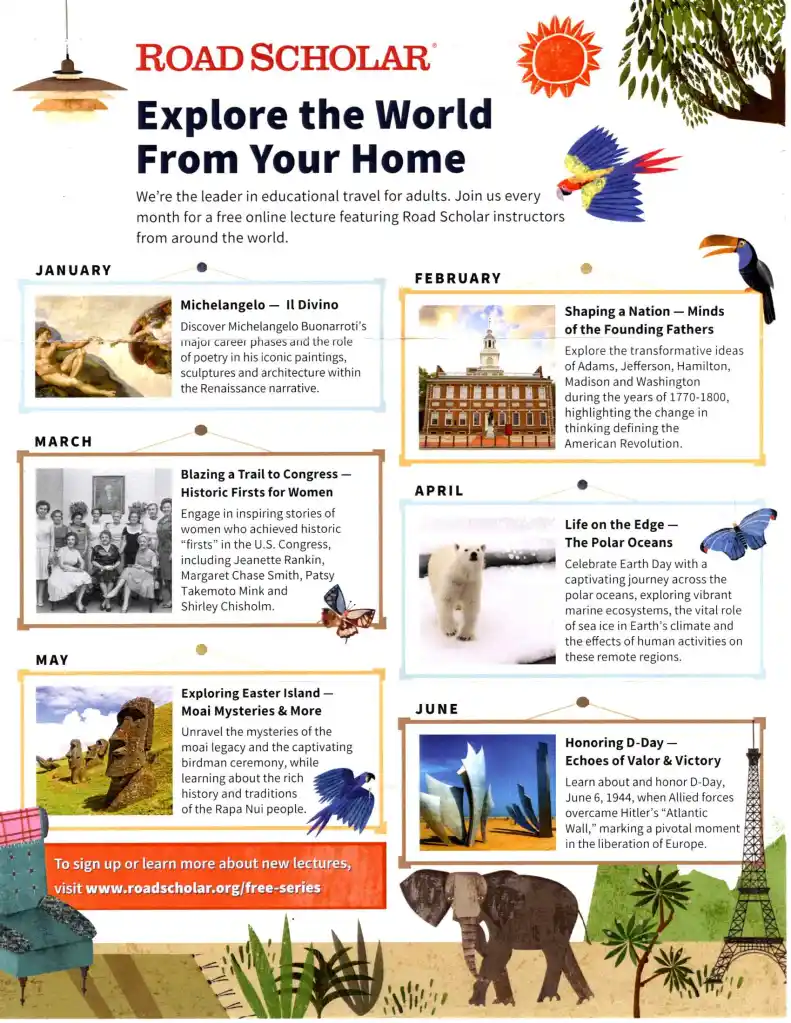 - Bring the world of Road Scholar home with you! Join a group of new friends and expert instructors for an “Adventure Online” and be fully engaged in a multi-day program of live lectures, performances, discussions and more. These online learning adventures offer a unique way to explore fascinating topics and destinations without leaving your living room. The upcoming free lectures are listed below on the flyer.